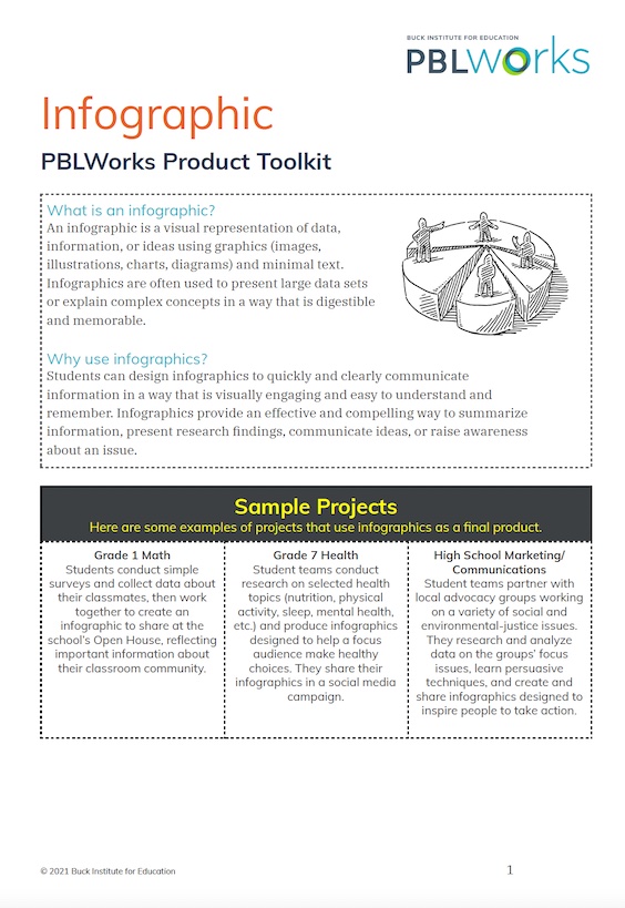 An infographic is a visual representation of data, information, or ideas using graphics (images, illustrations, charts, diagrams) and minimal text. Infographics are often used to present large data sets or explain complex concepts in a way that is digestible and memorable. Download the PDF to learn how to guide your students through the process of making infographics in PBL.